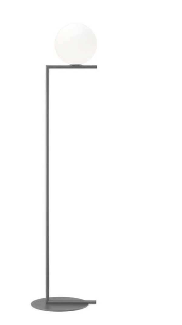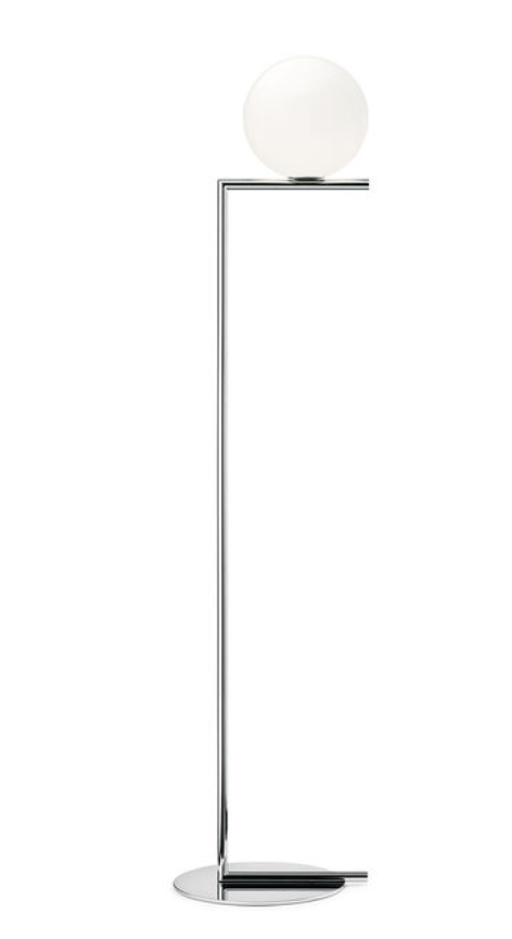 Lampadaire à lumière diffuse. Structure en laiton, brossé et verni transparent ou acier chromé. Diffuseur opale en verre soufflé. Variateur sur le câble d'alimentation.