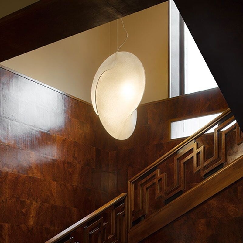 Suspension à lumière diffuse. Structure interne en acier peint par poudre blanche. Diffuseur en résine Cocoon pulvérisée sur la structure avec protection transparente pulvérisée en fin de travail, anneau de remplacement de lampoule en acier finition Poli et Doré Galvanisé. Rosace en Zamac moulé sous pression finition Poli et Doré Galvanisé.