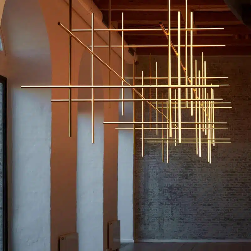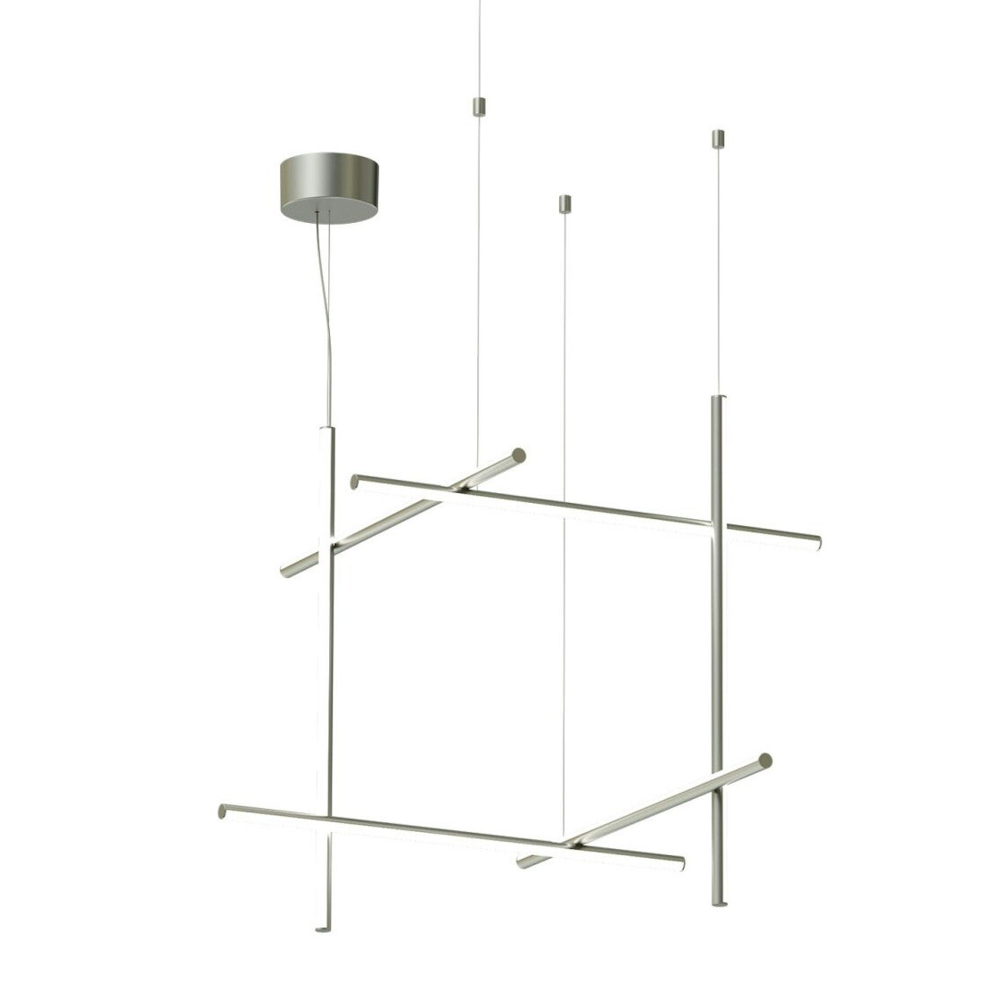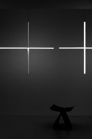 Coordinates est un système déclairage à lumière diffuse composé de tiges horizontales et verticales disposées sous forme de grilles lumineuses de différentes formes plus ou moins complexes. Chaque tige est composée dun corps en aluminium extrudé usiné et anodisé coloris champagne, et dun diffuseur en silicone optique platinium, avec strip led intégré (CRI 95). Chacune des tiges est alimentée et maintenue grâce à un système de connexion électrique et mécanique invisible, étudié spécialement pour permettre la composition de 4 modèles de suspension différents (S1, S2, S3, S4) avec des câbles de 2,4mt de long. Est également disponible le modèle Module S, dont la géométrie a été étudiée pour être répétée plusieurs fois et créer de grandes grilles dans le cadre de projets. Chaque configuration Coordinates comprend sa propre rosace, dont l'électronique intégrée permet d'utiliser plusieurs systèmes de variation : push, 1-10V, DALI. Il est possible de définir le flux lumineux lors de linstallation avec un système « push » inclus dans la rosace, si ces systèmes ne sont pas disponibles. Pour les installations avec alimentation à distance, chaque configuration est disponible en version Cl.III.