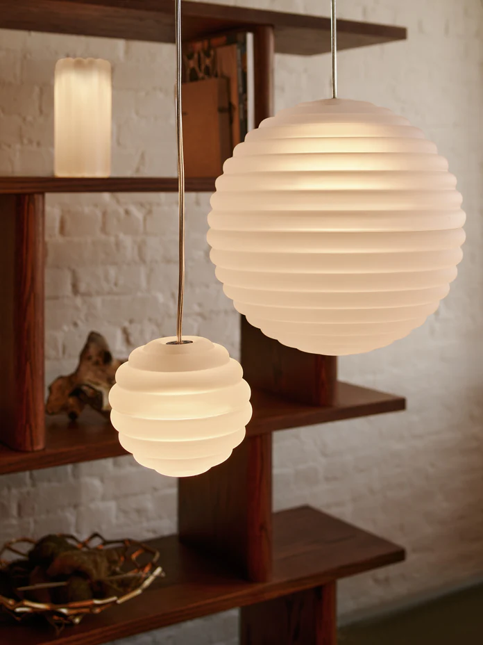 Press est une série de luminaires fabriqués à partir d’un verre très épais et très transparent. Leur forme rebondie rappelle les bouées de navigation et les jouets d'enfants. Le verre rainuré assure une excellente diffusion de la lumière, tout en projetant ses motifs rayés linéaires.